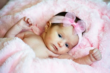 Here is another example of a newborn portrait done within the convenience of the client's home. I like this particularly image for a couple of reasons. The first is the infant is very bright eyed, you can see a very nice catch light in her eyes, and the environment appears to be very snuggly and comfy. Nothing fancy in this picture: a pretty pink bow for her head and a soft fluffy pink blanket to wrap her up in so she was warm and comfortable. This highly sophisticated studio is actually the client's dark green couch. The colored image was converted to black and white with Nik Silver Efex Pro 2.