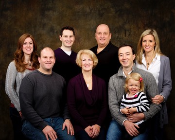 This is a recent family portrait I did in the studio. While I generally prefer to shoot portraits outside of the studio (except for head shots), this was a bit more challenging because of the number of individual. I had two front lights roughly set equality at f11 and I had two back light that were not pointed toward the backdrop but up against the white ceiling tiles (metered to be the same at about f8 or so). This strategy allowed for a very broad and soft light from above that also added a bit of light to the background yield nice separation from the background.